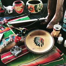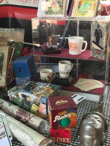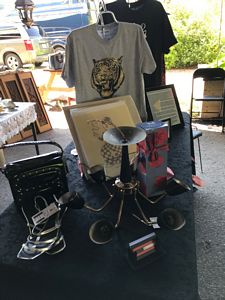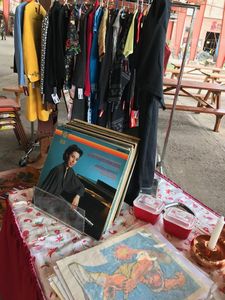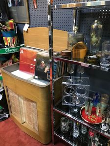 We modified an old record player to hold the records for sale. |
